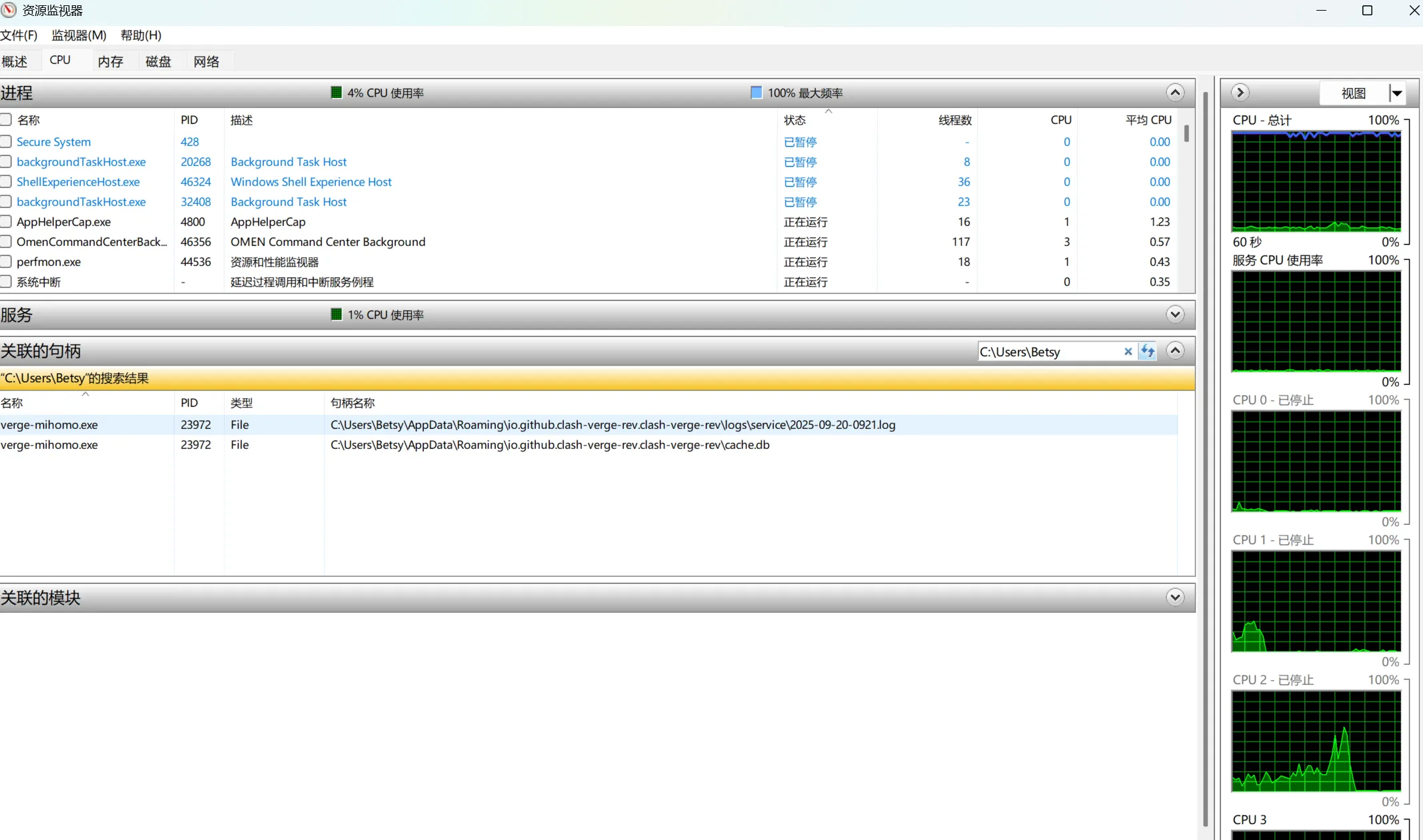 然后在资源监视器的CPU页面的关联句柄搜索框中输入你的用户名,找到相关进程并结束它们(需要重启则重启,后续仍选择超级管理员,误进入原来的用户导致错乱后果自负!!!)